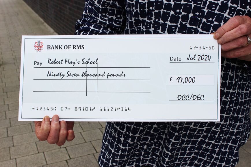 The Headteacher, students and Mrs Anna Rigby, Chair of Trustees, RMS, received the cheque from Mrs Jane Pratt MBE, Chair of OEC, Mr John Champion, Chair of OCC and Mr Kevin Lee, Financial Director of OCC and OEC.