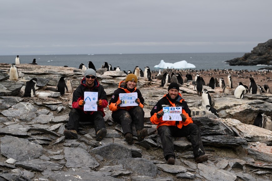 Derren took the group photo after chick weighing, and pictured are Jerry Gilham (Station Leader), Monica Aquilino (visiting Spanish scientist) and Fraser Halcroft (Medic).